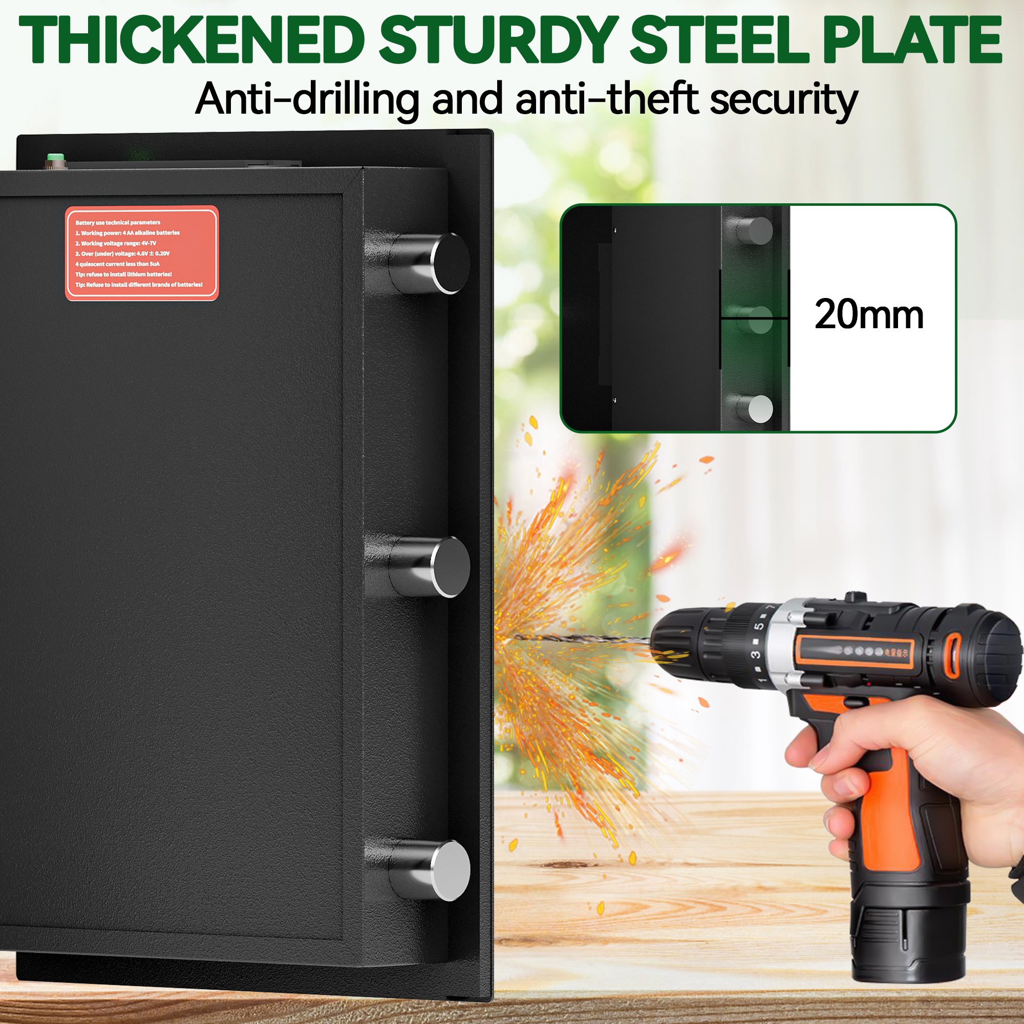 Durable Steel Construction :This home safe is made of solid steel construction with coating, With 3 enhanced live steel locking bolts, concealed hinges & recessed door, is good in anti-drilling, anti-prying, anti-collision and anti-falling. 10mm integrated metal door panel is strong, the door won't lean forward, not easy to fall and well prevent against break-in after being locked.